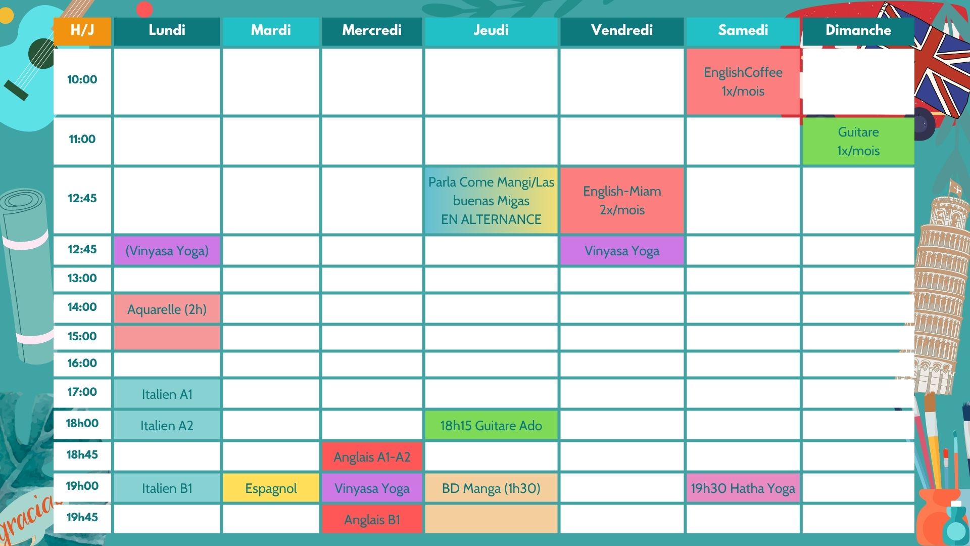 Nous proposons des cours régulier de langues (anglais, espagnol, italien), de yoga (Hatha et Vinyasa yoga), de dessin et aquarelle (à venir) ainsi que des retraites yoga, stage et activités ponctuelles de guitare, théâtre, photo, mosaïque, relaxation….