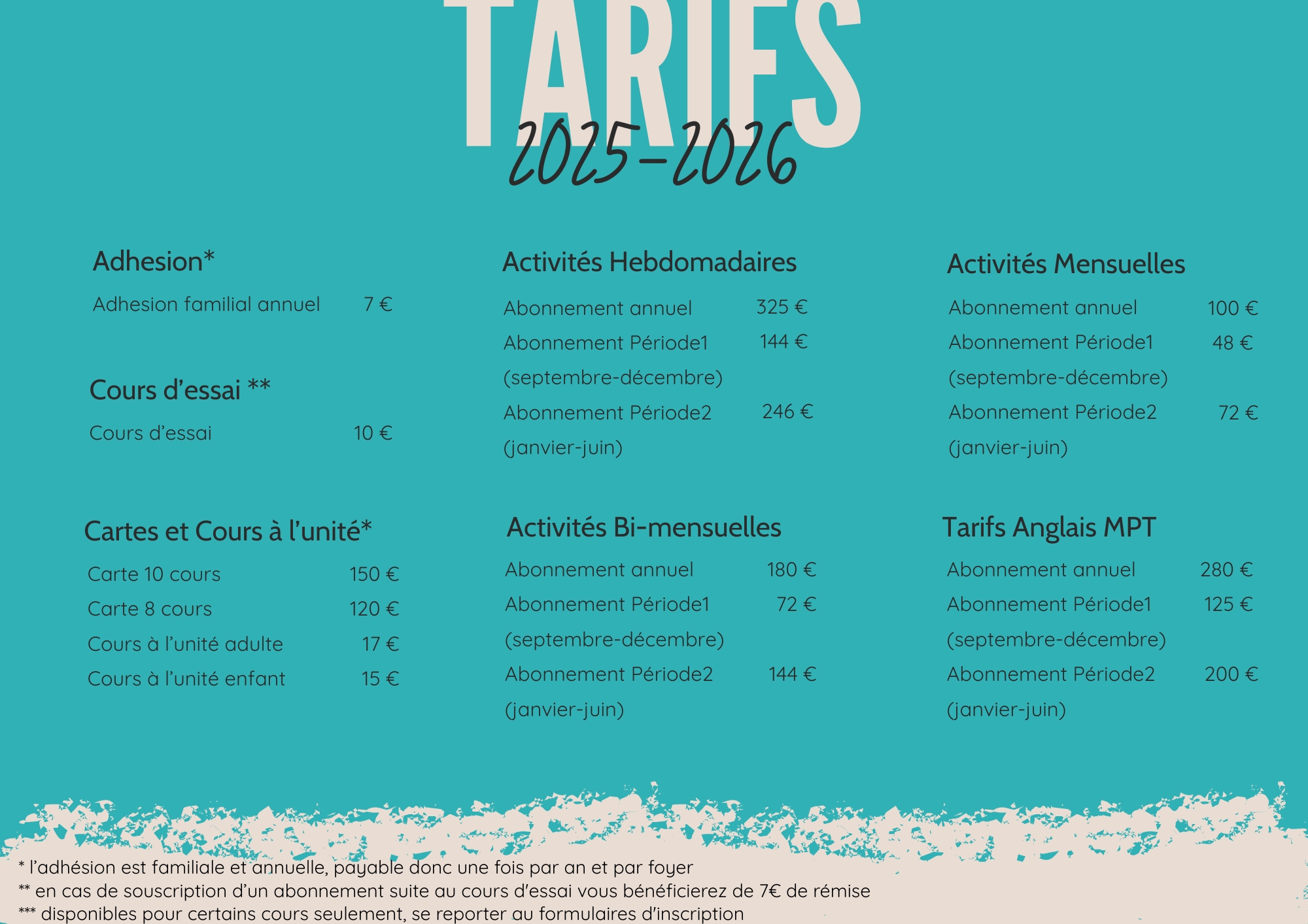 Voici nos tarifs pour l’année 2025-2026, valables à partir de septembre.